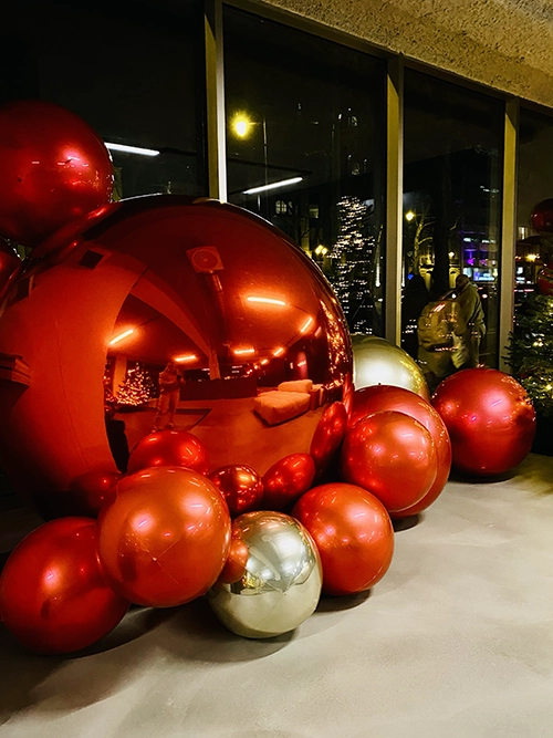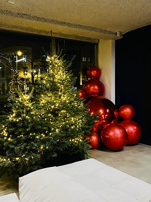 Pour la décoration de Noël, j’ai imaginé une scénographie surréaliste et architecturale avec des boules de Noël XXL et des sapins épurés, afin de créer une décoration différenciante mais cohérente avec l’univers de la maison.